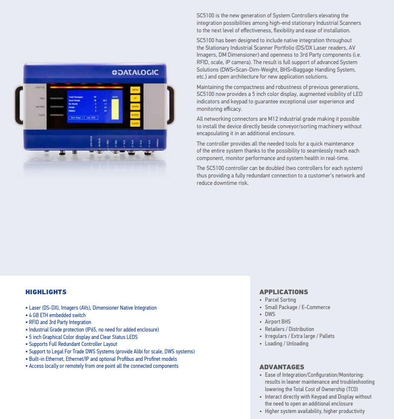 得利捷SC5100固定式工业系统控制器的设计包含了整个固定式工业扫描器组合(DS/DX系列激光阅读器、AV系列扫描器、DM系列体积测量仪)的本公司产品集成,且支持第三方组件(如RFID、秤、网络相机)的集成开放接口。其结果是完全支持的系统解决方案(DWS=Scan-Dim-Weight,BHS=Baggage Handling等),并为新的应用解决方案提供